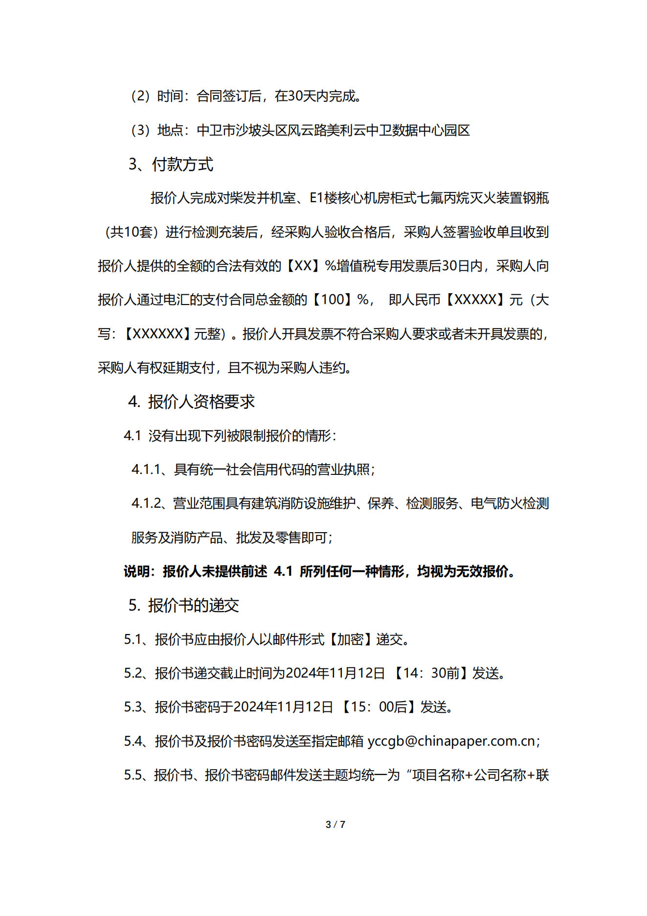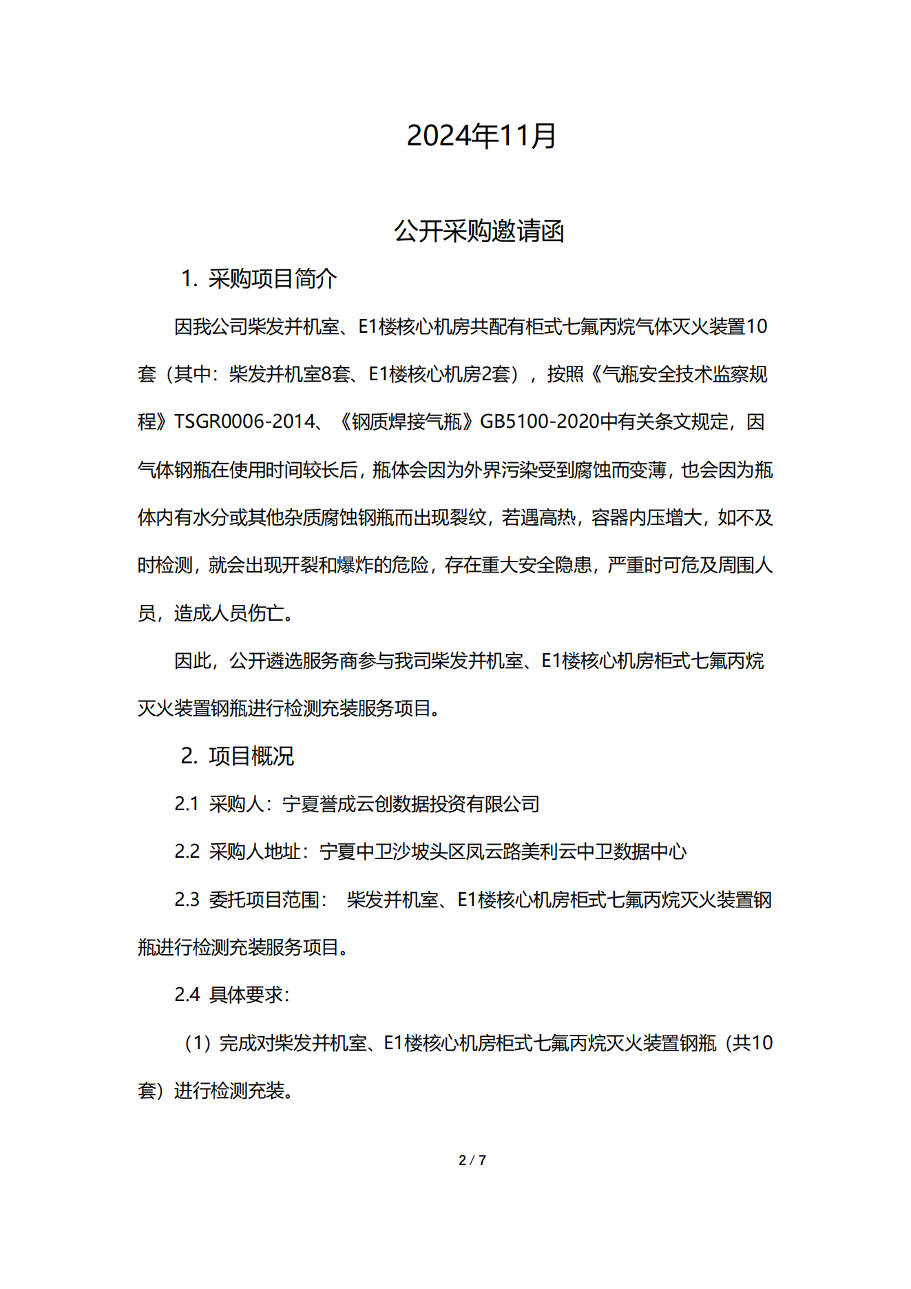 宁夏誉成云创数据投资有限公司(简称“誉成云创”),英国365集团官网中卫数据中心柴发并机室、E1楼核心机房共配有柜式七氟丙烷气体灭火装置10套(其中:柴发并机室8套、E1楼核心机房2套),按照《气瓶安全技术监察规程》TSGR0006-2014、《钢质焊接气瓶》GB5100-2020中有关条文规定,因气体钢瓶在使用时间较长后,瓶体会因为外界污染受到腐蚀而变薄,也会因为瓶体内有水分或其他杂质腐蚀钢瓶而出现裂纹,若遇高热,容器内压增大,如不及时检测,就会出现开裂和爆炸的危险,存在重大安全隐患,严重时可危及周围人员,造成人员伤亡。 因此,公开遴选服务商参与我司柴发并机室、E1楼核心机房柜式七氟丙烷灭火装置钢瓶进行检测充装服务项目。 采购信息详见附件【关于《宁夏誉成云创数据投资有限公司柴发并机室、E1楼核心机房柜式七氟丙烷灭火装置钢瓶进行检测充装服务项目》采购文件】。